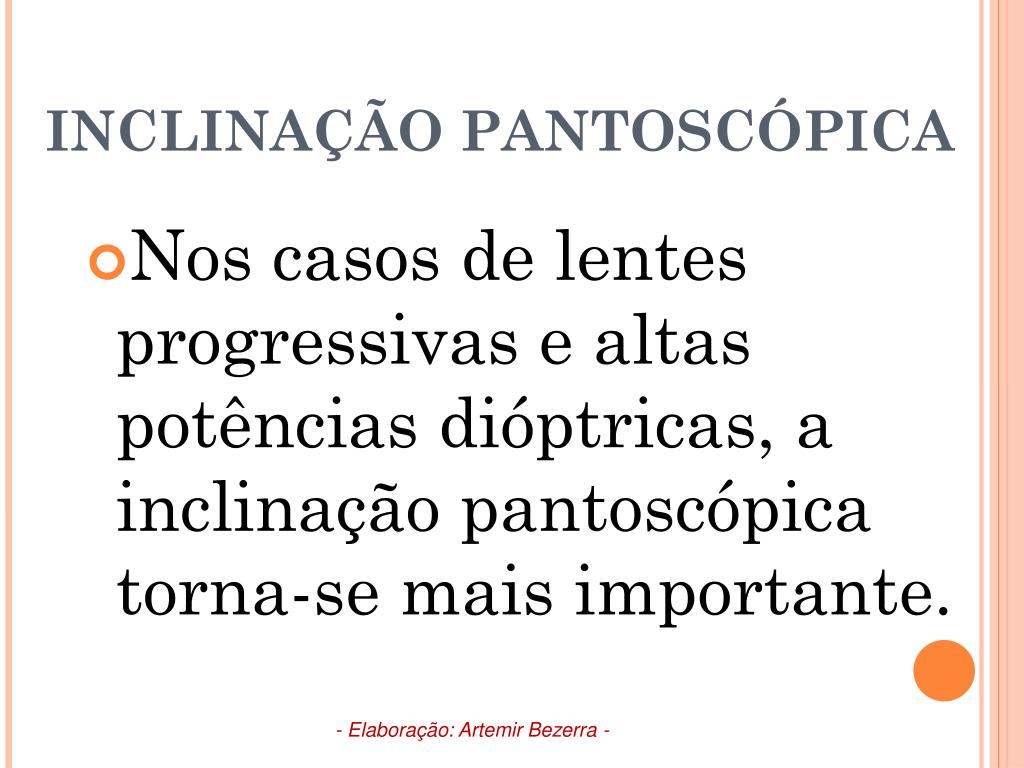 INCLINAÇÃO PANTOSCÓPICA • Nos casos de lentes progressivas e altas potências dióptricas, a inclinação pantoscópica torna-se mais importante. - Elaboração: Artemir Bezerra -
