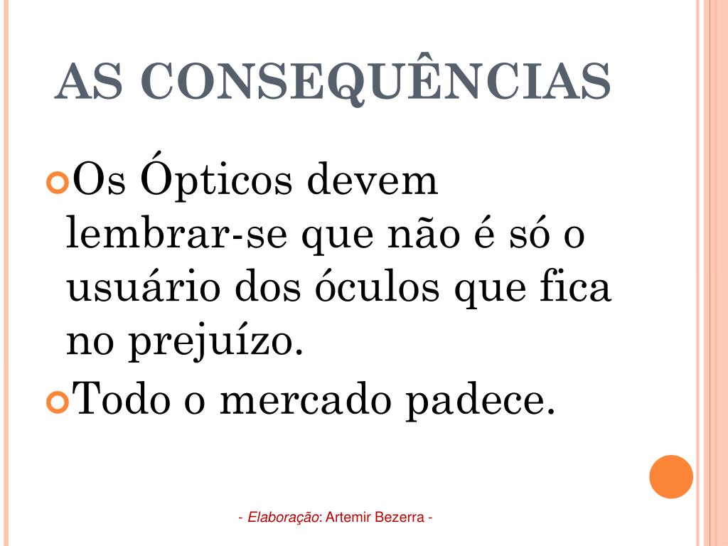 AS CONSEQUÊNCIAS • Os Ópticos devem lembrar-se que não é só o usuário dos óculos que fica no prejuízo. • Todo o mercado padece. - Elaboração: Artemir Bezerra -