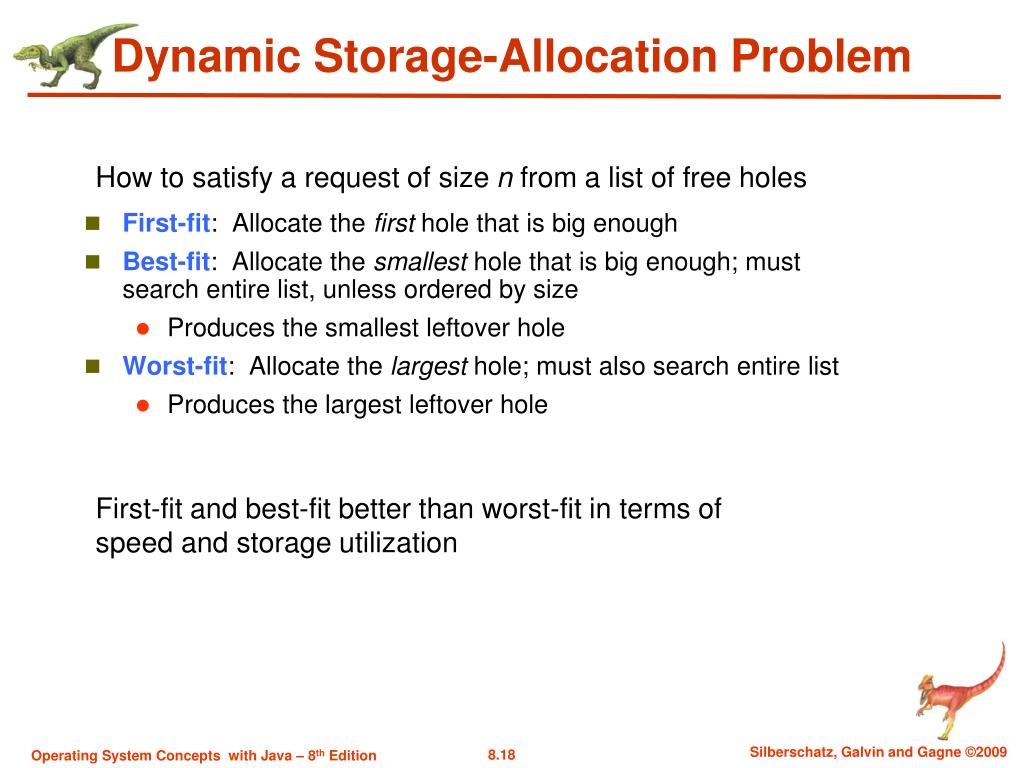 Dynamic Storage-Allocation Problem First-fit: Allocate the first hole that is big enough Best-fit: Allocate the smallest hole that is big enough; must search entire list, unless ordered by size Produces the smallest leftover hole Worst-fit: Allocate the largest hole; must also search entire list Produces the largest leftover hole How to satisfy a request of size n from a list of free holes First-fit and best-fit better than worst-fit in terms of speed and storage utilization