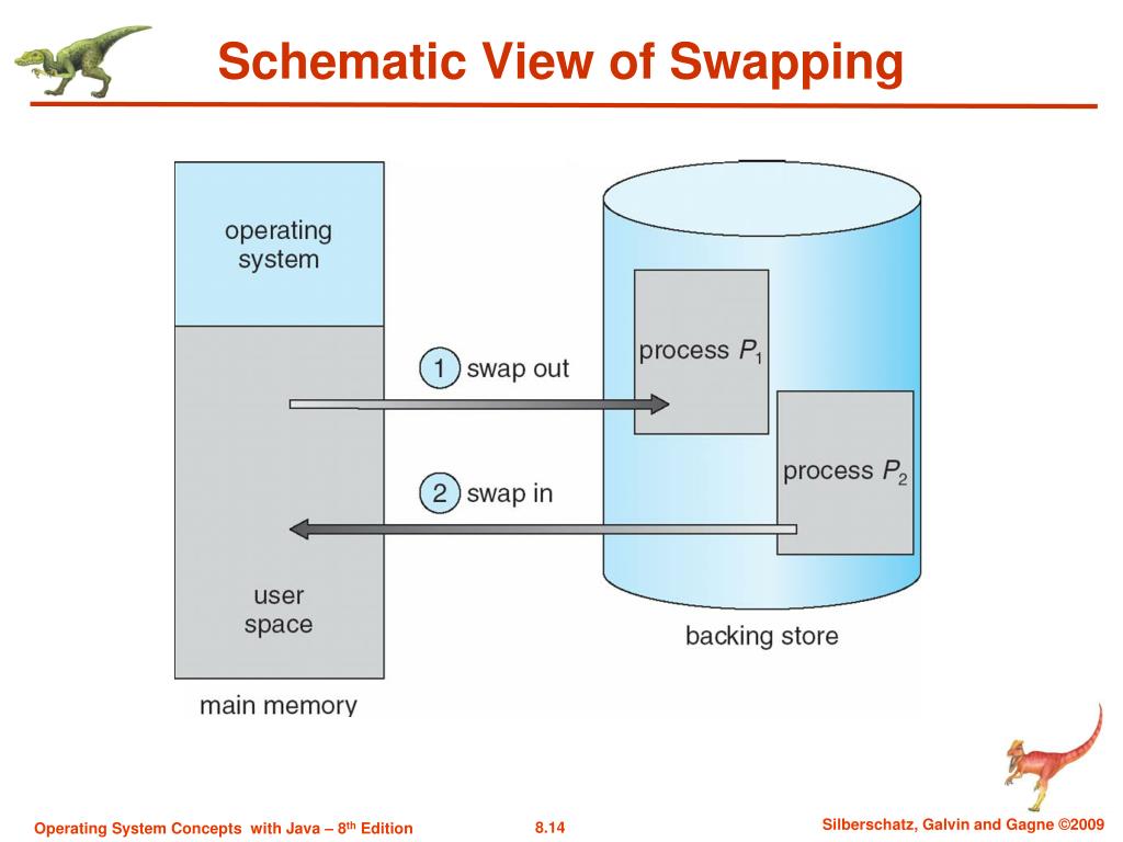 Swapping A process can be swapped temporarily out of memory to a backing store, and then brought back into memory for continued execution Backing store– fast disk large enough to accommodate copies of all memory images for all users; must provide direct access to these memory images Roll out, roll in– swapping variant used for priority-based scheduling algorithms; lower-priority process is swapped out so higher-priority process can be loaded and executed Major part of swap time is transfer time; total transfer time is directly proportional to the amount of memory swapped Modified versions of swapping are found on many systems (i.e., UNIX, Linux, and Windows) System maintains a ready queueof ready-to-run processes which have memory images on disk