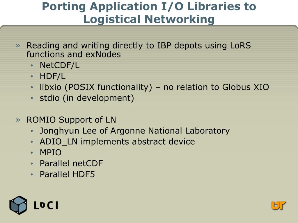 Porting Application I/O Libraries to Logistical Networking • Reading and writing directly to IBP depots using LoRS functions and exNodes • NetCDF/L • HDF/L • libxio (POSIX functionality) – no relation to Globus XIO • stdio (in development) • ROMIO Support of LN • Jonghyun Lee of Argonne National Laboratory • ADIO_LN implements abstract device • MPIO • Parallel netCDF • Parallel HDF5