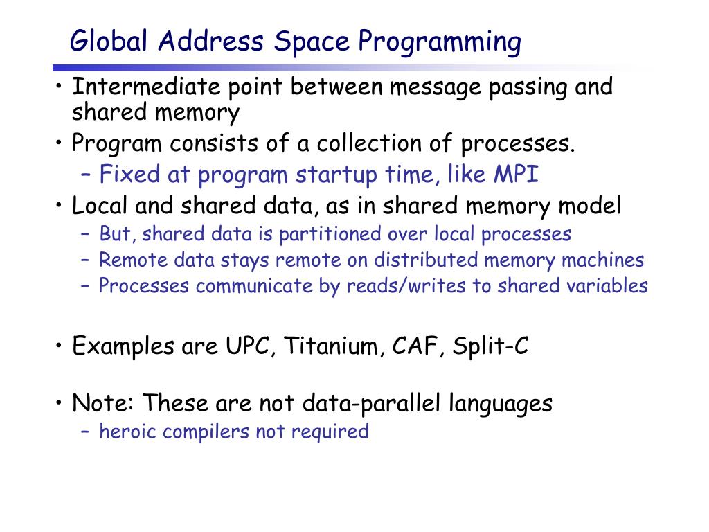 Global Address Space Programming • Intermediate point between message passing and shared memory • Program consists of a collection of processes. • Fixed at program startup time, like MPI • Local and shared data, as in shared memory model • But, shared data is partitioned over local processes • Remote data stays remote on distributed memory machines • Processes communicate by reads/writes to shared variables • Examples are UPC, Titanium, CAF, Split-C • Note: These are not data-parallel languages • heroic compilers not required