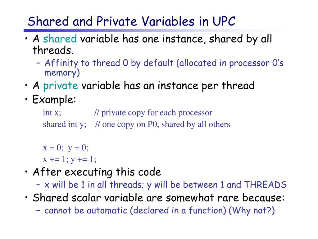 Shared and Private Variables in UPC • A shared variable has one instance, shared by all threads. • Affinity to thread 0 by default (allocated in processor 0’s memory) • A private variable has an instance per thread • Example: int x; // private copy for each processor shared int y; // one copy on P0, shared by all others x = 0; y = 0; x += 1; y += 1; • After executing this code • x will be 1 in all threads; y will be between 1 and THREADS • Shared scalar variable are somewhat rare because: • cannot be automatic (declared in a function) (Why not?)