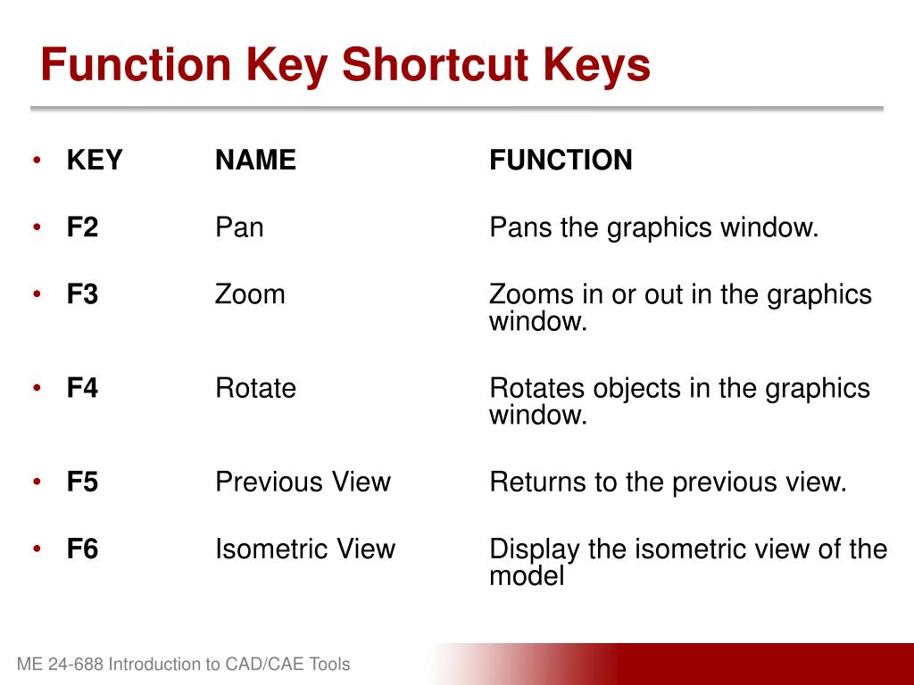 Function Key Shortcut Keys • KEY NAME FUNCTION • F2 Pan Pans the graphics window. • F3 Zoom Zooms in or out in the graphics window. • F4 Rotate Rotates objects in the graphics window. • F5 Previous View Returns to the previous view. • F6 Isometric View Display the isometric view of the model