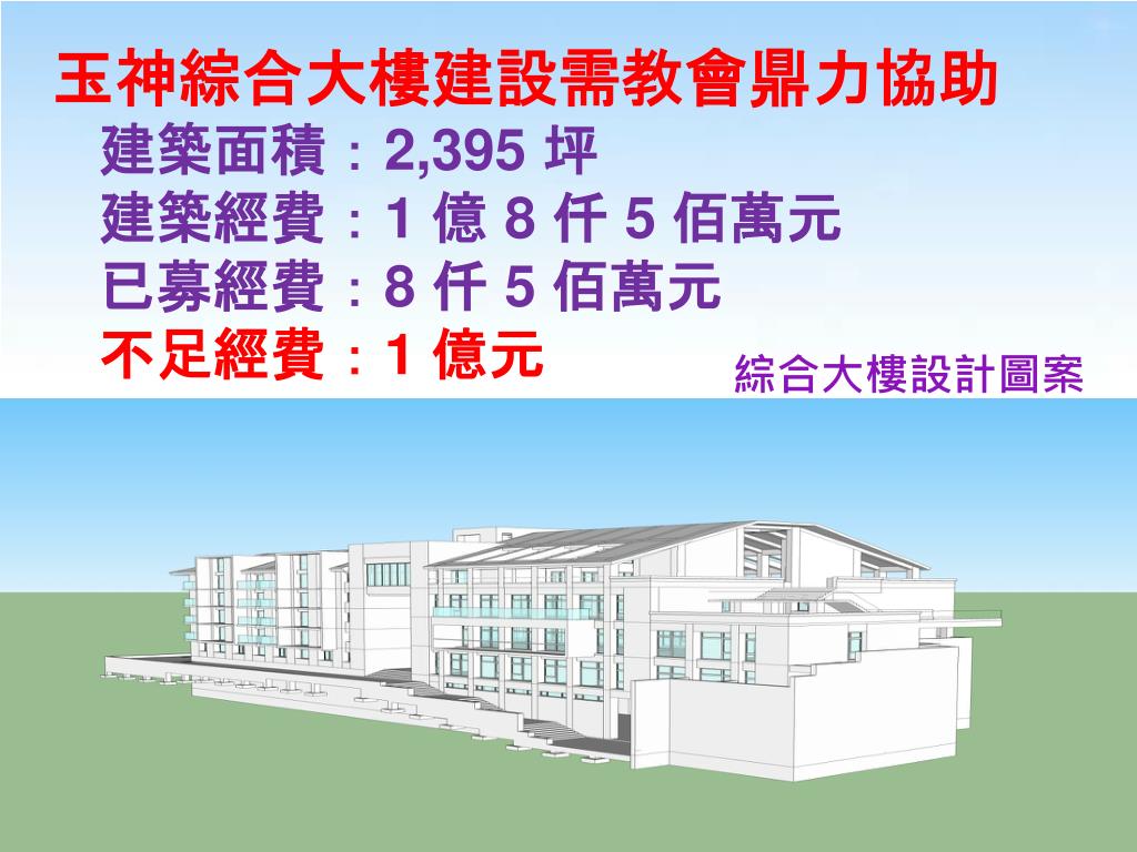 玉神綜合大樓建設需教會鼎力協助 建築面積:2,395 坪 建築經費:1 億 8 仟 5 佰萬元 已募經費:8 仟 5 佰萬元 不足經費:1 億元 綜合大樓設計圖案