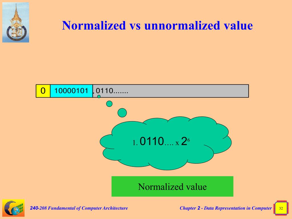 Normalized vs unnormalized value 1. 0110…. x 26 Normalized value