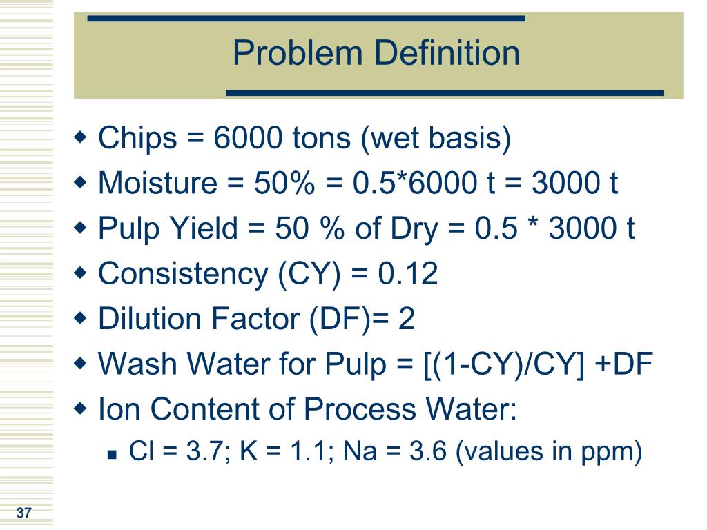Problem Definition • Chips = 6000 tons (wet basis) • Moisture = 50% = 0.5*6000 t = 3000 t • Pulp Yield = 50 % of Dry = 0.5 * 3000 t • Consistency (CY) = 0.12 • Dilution Factor (DF)= 2 • Wash Water for Pulp = [(1-CY)/CY] +DF • Ion Content of Process Water: • Cl = 3.7; K = 1.1; Na = 3.6 (values in ppm)