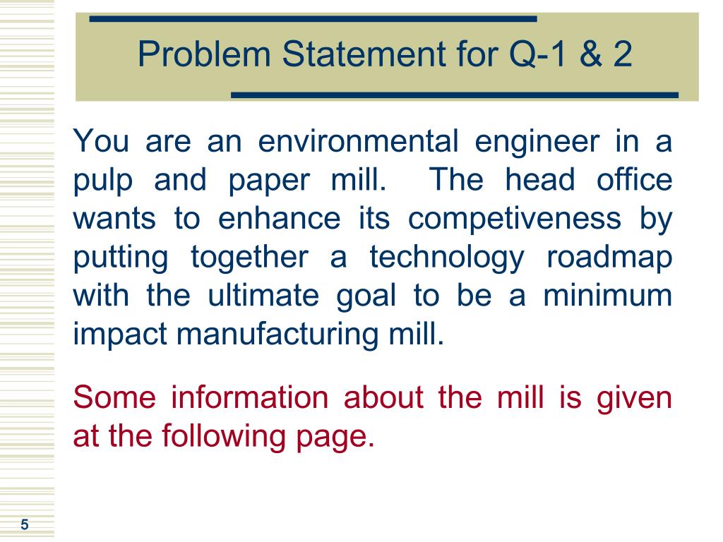 Problem Statement for Q-1 & 2 You are an environmental engineer in a pulp and paper mill. The head office wants to enhance its competiveness by putting together a technology roadmap with the ultimate goal to be a minimum impact manufacturing mill. Some information about the mill is given at the following page.