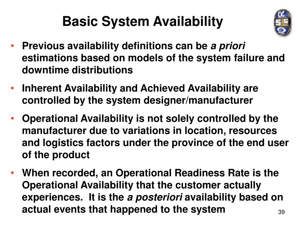 Basic System Availability • Previous availability definitions can be a priori estimations based on models of the system failure and downtime distributions • Inherent Availability and Achieved Availability are controlled by the system designer/manufacturer • Operational Availability is not solely controlled by the manufacturer due to variations in location, resources and logistics factors under the province of the end user of the product • When recorded, an Operational Readiness Rate is the Operational Availability that the customer actually experiences. It is the a posteriori availability based on actual events that happened to the system