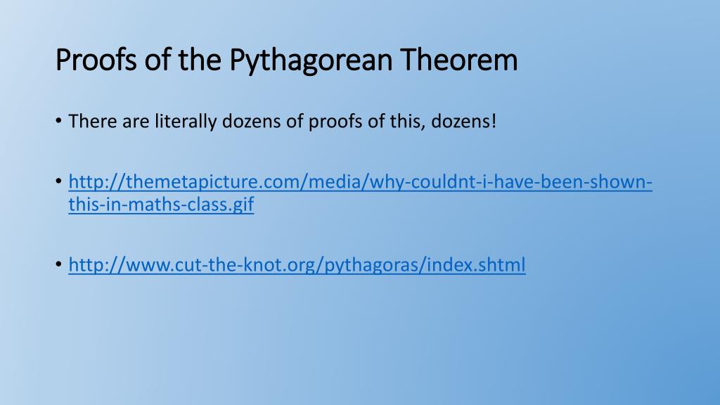 Proofs of the Pythagorean Theorem • There are literally dozens of proofs of this, dozens! • http://themetapicture.com/media/why-couldnt-i-have-been-shown-this-in-maths-class.gif • http://www.cut-the-knot.org/pythagoras/index.shtml