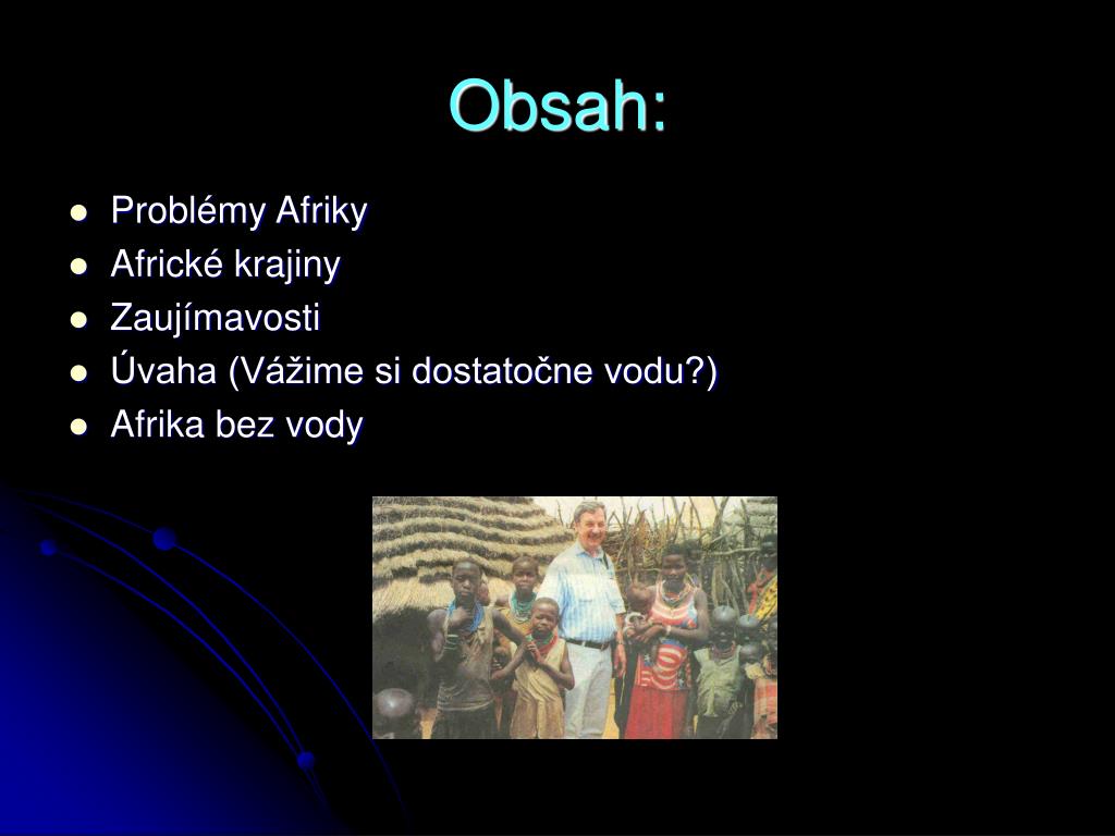 Obsah: • Problémy Afriky • Africké krajiny • Zaujímavosti • Úvaha (Vážime si dostatočne vodu?) • Afrika bez vody