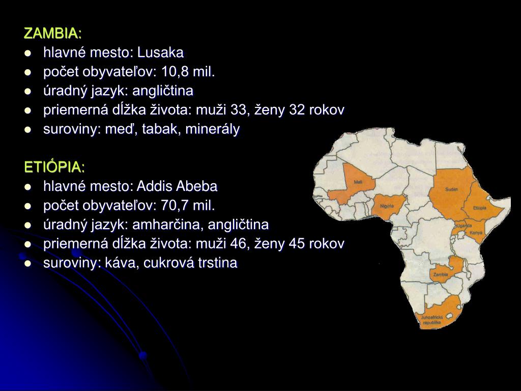 ZAMBIA: • hlavné mesto: Lusaka • počet obyvateľov: 10,8 mil. • úradný jazyk: angličtina • priemerná dĺžka života: muži 33, ženy 32 rokov • suroviny: meď, tabak, minerály ETIÓPIA: • hlavné mesto: Addis Abeba • počet obyvateľov: 70,7 mil. • úradný jazyk: amharčina, angličtina • priemerná dĺžka života: muži 46, ženy 45 rokov • suroviny: káva, cukrová trstina