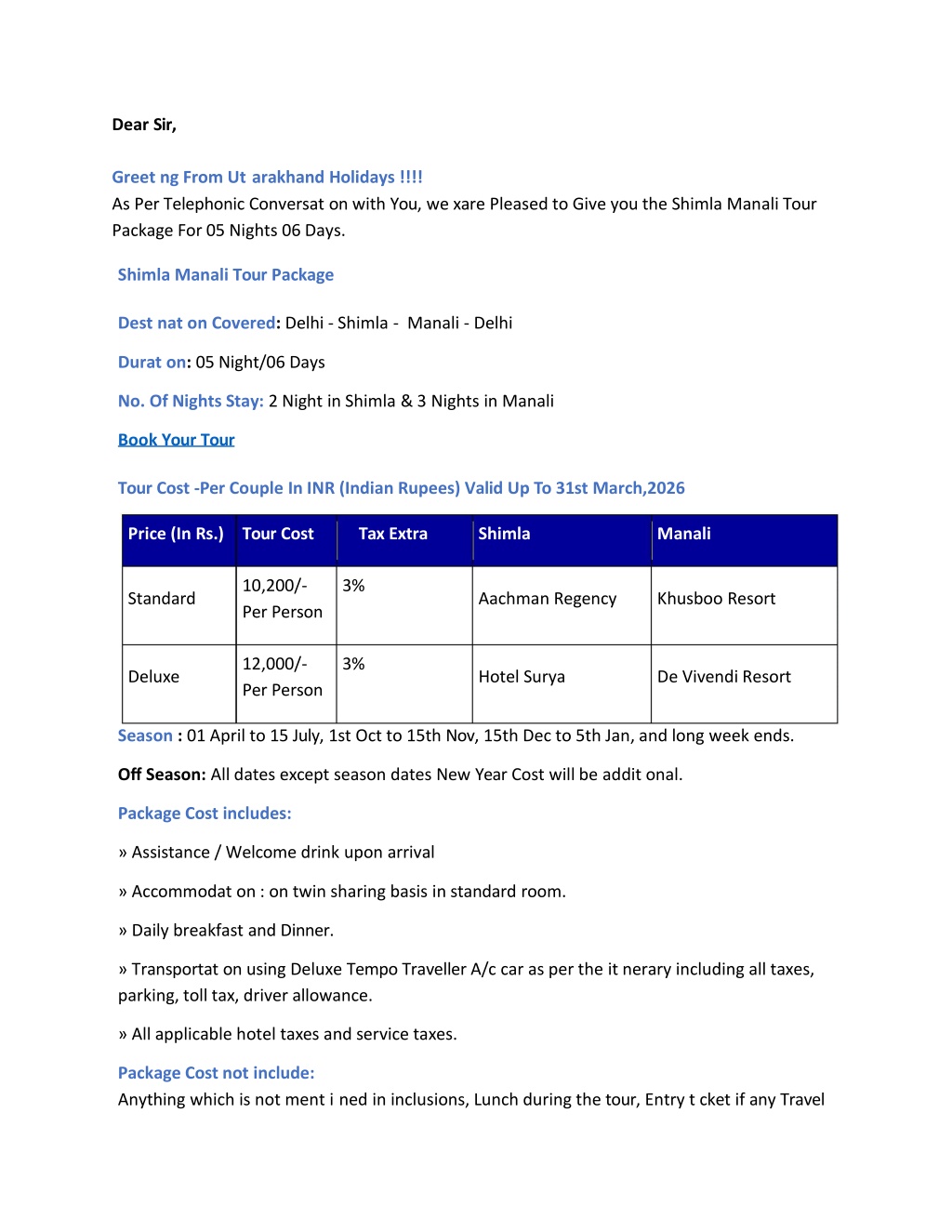 Dear Sir, Greet ng From Ut arakhand Holidays !!!! As Per Telephonic Conversat on with You, we xare Pleased to Give you the Shimla Manali Tour Package For 05 Nights 06 Days. Shimla Manali Tour Package Dest nat on Covered: Delhi - Shimla - Manali - Delhi Durat on: 05 Night/06 Days No. Of Nights Stay: 2 Night in Shimla & 3 Nights in Manali Book Your Tour Tour Cost -Per Couple In INR (Indian Rupees) Valid Up To 31st March,2026 Price (In Rs.) Tour Cost Tax Extra Shimla Manali 10,200/- Per Person 3% Standard Aachman Regency Khusboo Resort 12,000/- Per Person 3% Deluxe Hotel Surya De Vivendi Resort Season : 01 April to 15 July, 1st Oct to 15th Nov, 15th Dec to 5th Jan, and long week ends. Off Season: All dates except season dates New Year Cost will be addit onal. Package Cost includes: » Assistance / Welcome drink upon arrival » Accommodat on : on twin sharing basis in standard room. » Daily breakfast and Dinner. » Transportat on using Deluxe Tempo Traveller A/c car as per the it nerary including all taxes, parking, toll tax, driver allowance. » All applicable hotel taxes and service taxes. Package Cost not include: Anything which is not ment i ned in inclusions, Lunch during the tour, Entry t cket if any Travel