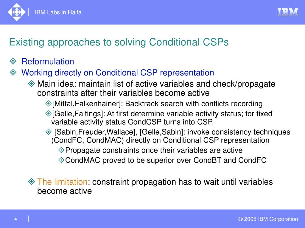 Existing approaches to solving Conditional CSPs • Reformulation • Working directly on Conditional CSP representation • Main idea: maintain list of active variables and check/propagate constraints after their variables become active • [Mittal,Falkenhainer]: Backtrack search with conflicts recording • [Gelle,Faltings]: At first determine variable activity status; for fixed variable activity status CondCSP turns into CSP. • [Sabin,Freuder,Wallace], [Gelle,Sabin]: invoke consistency techniques (CondFC, CondMAC) directly on Conditional CSP representation • Propagate constraints once their variables are active • CondMAC proved to be superior over CondBT and CondFC • The limitation: constraint propagation has to wait until variables become active