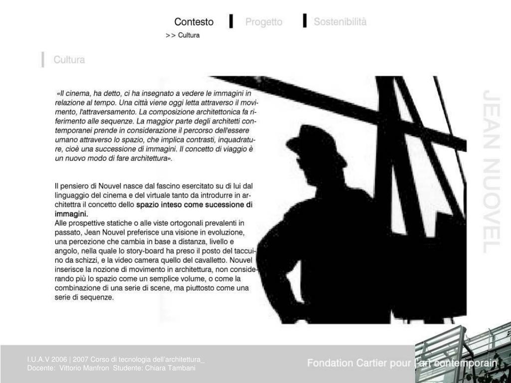 Jean Nuovel afferma: “ Ho analizzato il viale e il quartiere come una serie di riferimenti lasciati nella storia accumulati come delle stratificazioni. Tra essi ho voluto creare un riferimento degli anni novanta che sia una vera testimonianza culturale” da questo approccio è nato un edificio che si dissolve nell’ambiente circostante. I.U.A.V 2006 | 2007 Corso di tecnologia dell’architettura_ Docente: Vittorio Manfron Studente: Chiara Tambani