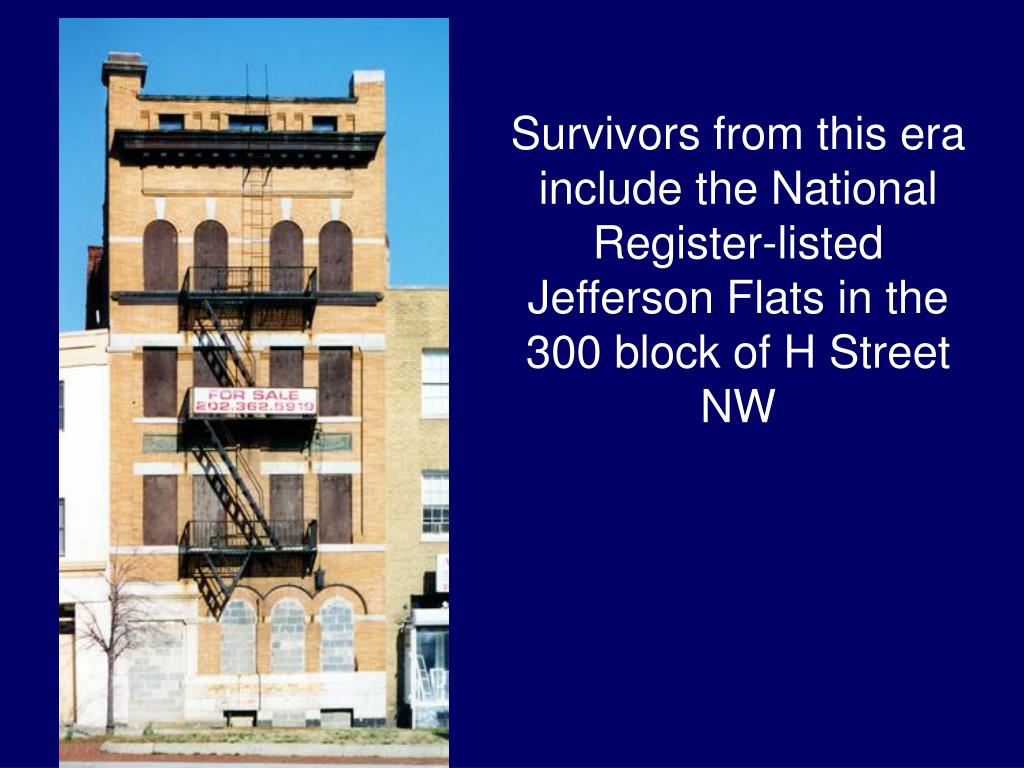 Survivors from this era include the National Register-listed Jefferson Flats in the 300 block of H Street NW