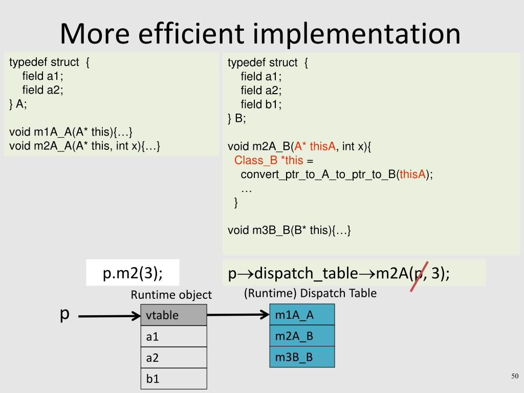 More efficient implementation typedefstruct{ field a1; field a2; } A; void m1A_A(A* this){…} void m2A_A(A* this, int x){…} typedefstruct { field a1; field a2; field b1; } B; void m2A_B(A* thisA, int x){ Class_B*this = convert_ptr_to_A_to_ptr_to_B(thisA); … } void m3B_B(B* this){…}