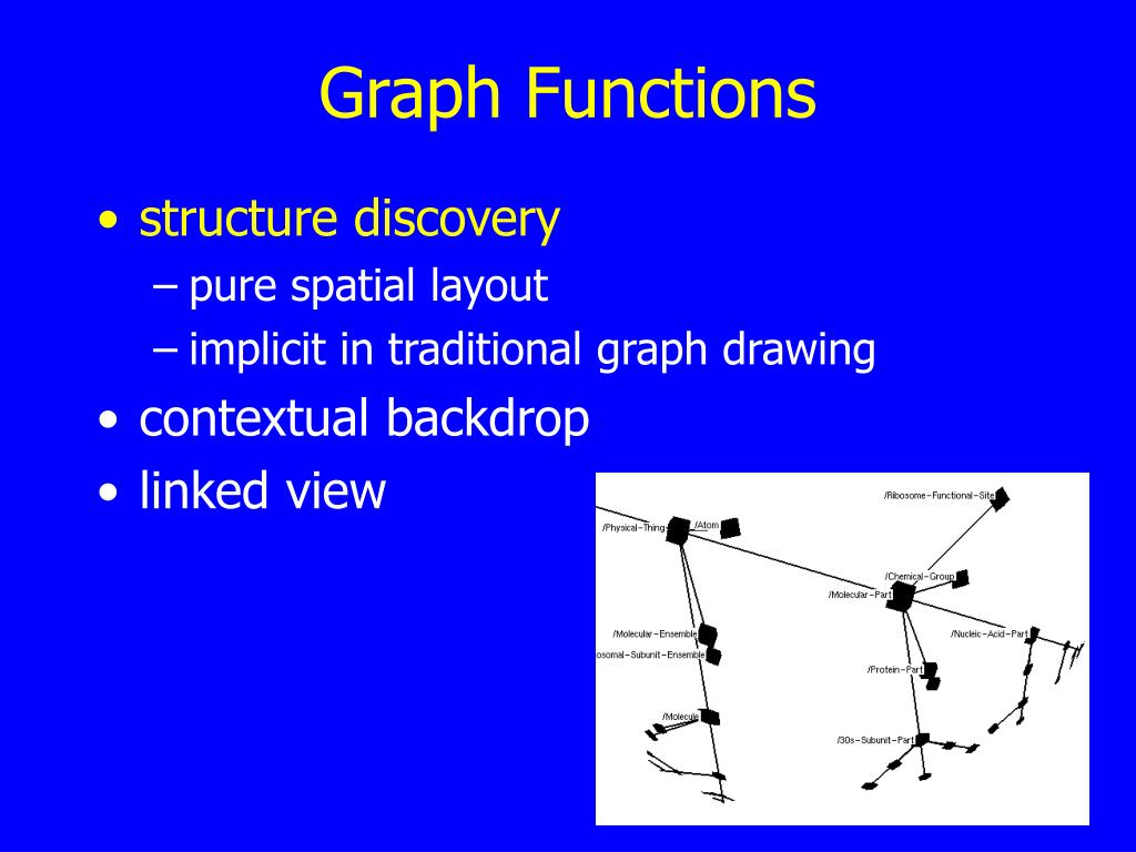 Graph Functions • structure discovery • pure spatial layout • implicit in traditional graph drawing • contextual backdrop • linked view