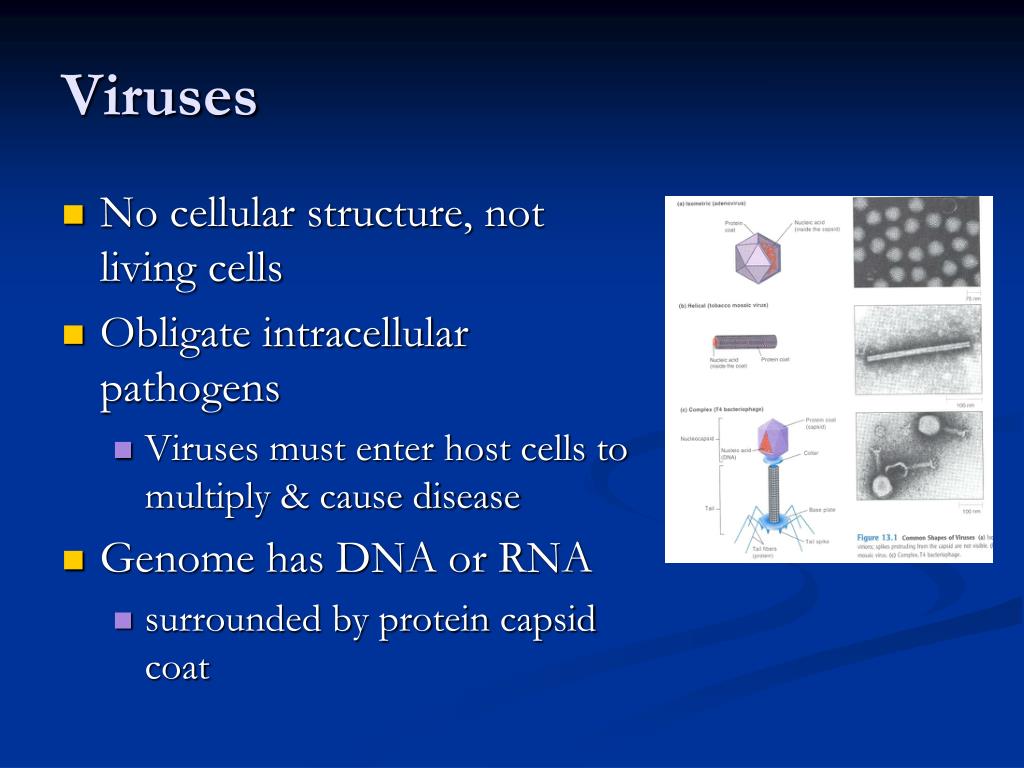 Viruses • No cellular structure, not living cells • Obligate intracellular pathogens • Viruses must enter host cells to multiply & cause disease • Genome has DNA or RNA • surrounded by protein capsid coat