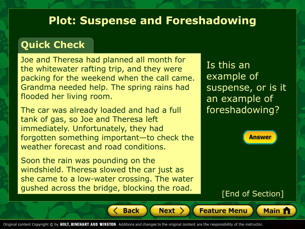 Plot: Suspense and Foreshadowing Quick Check Joe and Theresa had planned all month for the whitewater rafting trip, and they were packing for the weekend when the call came. Grandma needed help. The spring rains had flooded her living room. The car was already loaded and had a full tank of gas, so Joe and Theresa left immediately. Unfortunately, they had forgotten something important—to check the weather forecast and road conditions. Soon the rain was pounding on the windshield. Theresa slowed the car just as she came to a low-water crossing. The water gushed across the bridge, blocking the road. Is this an example of suspense, or is it an example of foreshadowing? [End of Section]