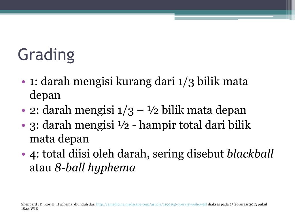 Grading • 1: darah mengisi kurang dari 1/3 bilik mata depan • 2: darah mengisi 1/3 – ½ bilik mata depan • 3: darah mengisi ½ - hampir total dari bilik mata depan • 4: total diisi oleh darah, sering disebut blackball atau 8-ball hyphema Sheppard JD, Roy H. Hyphema. diunduh dari http://emedicine.medscape.com/article/1190165-overview#showall diakses pada 25februrasi 2013 pukul 18.00WIB