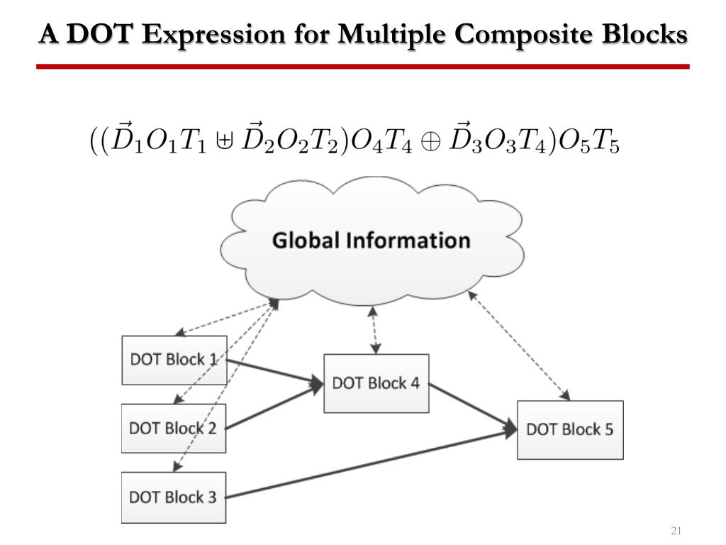 A Composite DOT block m independent elementary DOT blocks are organized as a composite DOT block tm t2 t1 … T-layer m 2 1 o2,1 o2,2 o2,m on,m on,2 on,1 o1,m o1,1 o1,2 … … … O-layer … 1 1 1 2 2 2 n n n D-layer … … … D1 D1 D1 D2 D2 D2 Dn Dn Dn