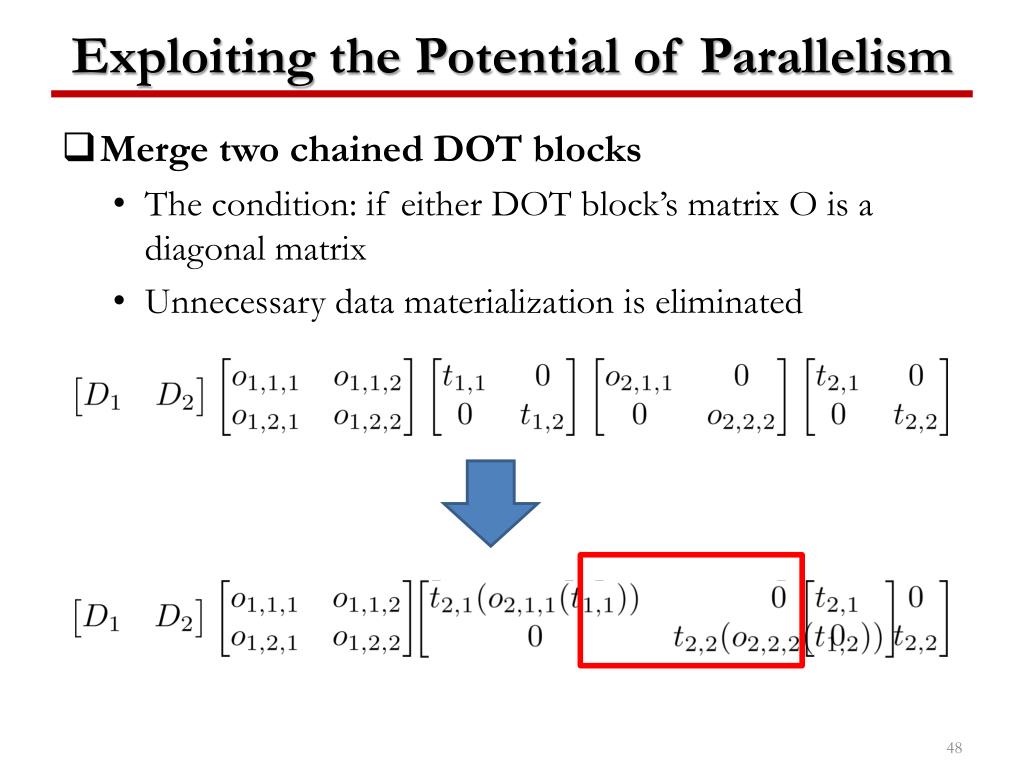 Exploiting the Potential of Parallelism • Merge two chained DOT blocks • The condition: if either DOT block’s matrix O is a diagonal matrix • Unnecessary data materialization is eliminated