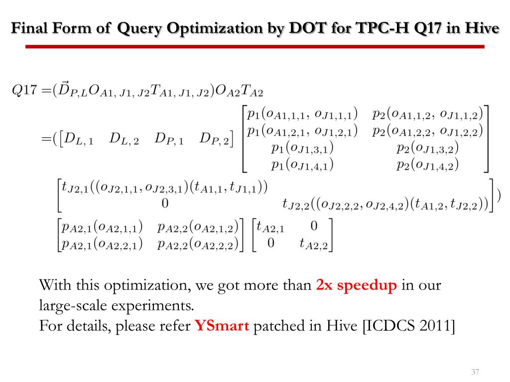 Final Form of Query Optimization by DOT for TPC-H Q17 in Hive With this optimization, we got more than 2x speedup in our large-scale experiments. For details, please refer YSmart patched in Hive [ICDCS 2011]