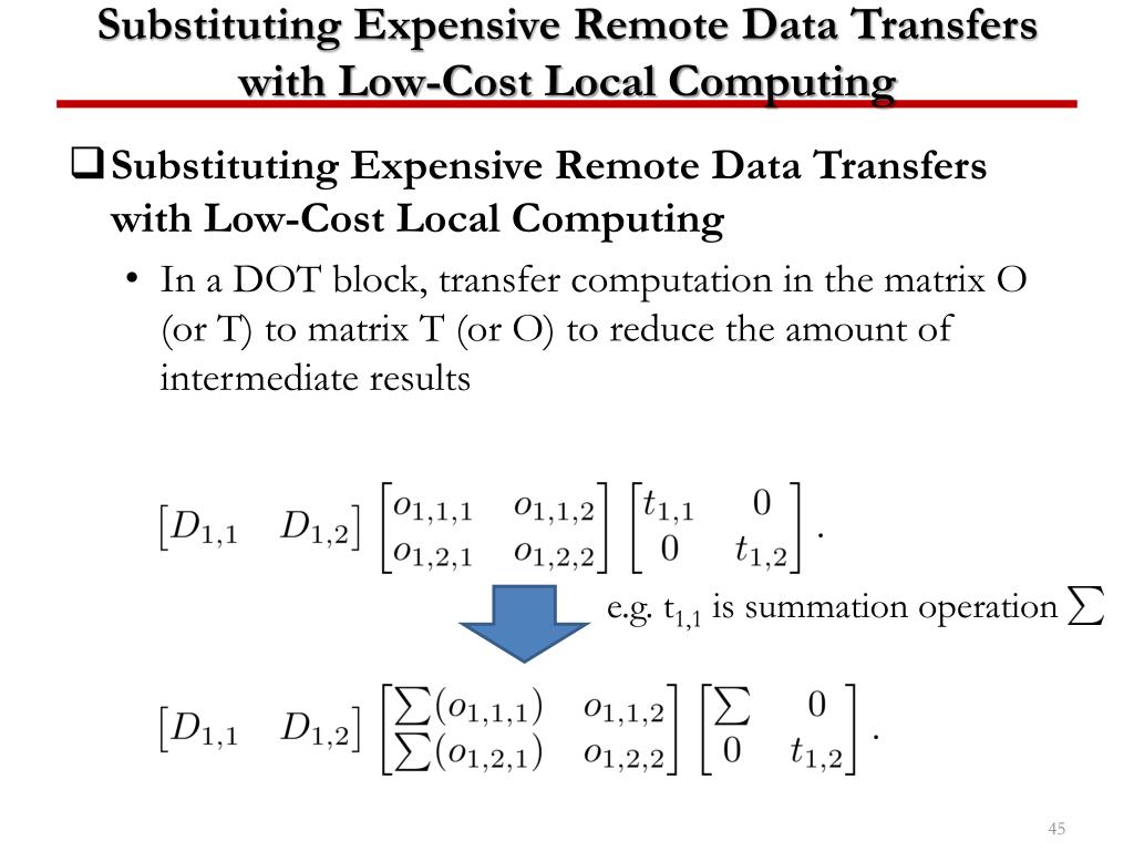 Substituting Expensive Remote Data Transfers with Low-Cost Local Computing • Substituting Expensive Remote Data Transfers with Low-Cost Local Computing • In a DOT block, transfer computation in the matrix O (or T) to matrix T (or O) to reduce the amount of intermediate results e.g. t1,1 is summation operation