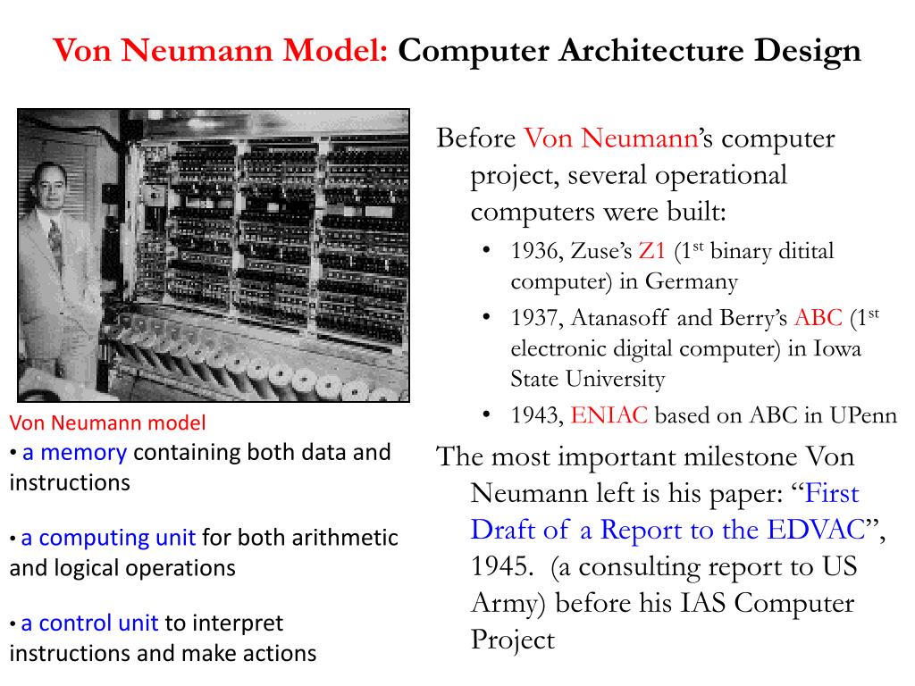 Von Neumann Model: Computer Architecture Design • Before Von Neumann’s computer project, several operational computers were built: • 1936, Zuse’sZ1 (1st binary ditital computer) in Germany • 1937, Atanasoff and Berry’s ABC (1st electronic digital computer) in Iowa State University • 1943, ENIAC based on ABC in UPenn • The most important milestone Von Neumann left is his paper: “First Draft of a Report to the EDVAC”, 1945. (a consulting report to US Army) before his IAS Computer Project • Von Neumann model • a memory containing both data and instructions • a computing unit for both arithmetic and logical operations • a control unit to interpret instructions and make actions