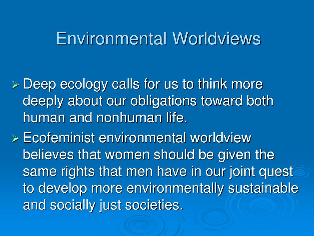 Environmental Worldviews • Deep ecology calls for us to think more deeply about our obligations toward both human and nonhuman life. • Ecofeminist environmental worldview believes that women should be given the same rights that men have in our joint quest to develop more environmentally sustainable and socially just societies.