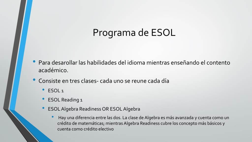 Programa de ESOL • Para desarollarlashabilidades del idiomamientrasenseñando el contentoacadémico. • Consiste en tresclases- cadauno se reunecadadía • ESOL 1 • ESOL Reading 1 • ESOL Algebra Readiness OR ESOL Algebra • Hay unadiferencia entre las dos. La clase de Algebra esmásavanzada y cuentacomo un crédito de matemáticas; mientras Algebra Readiness cubre los conceptomásbásicos y cuentacomocréditoelectivo