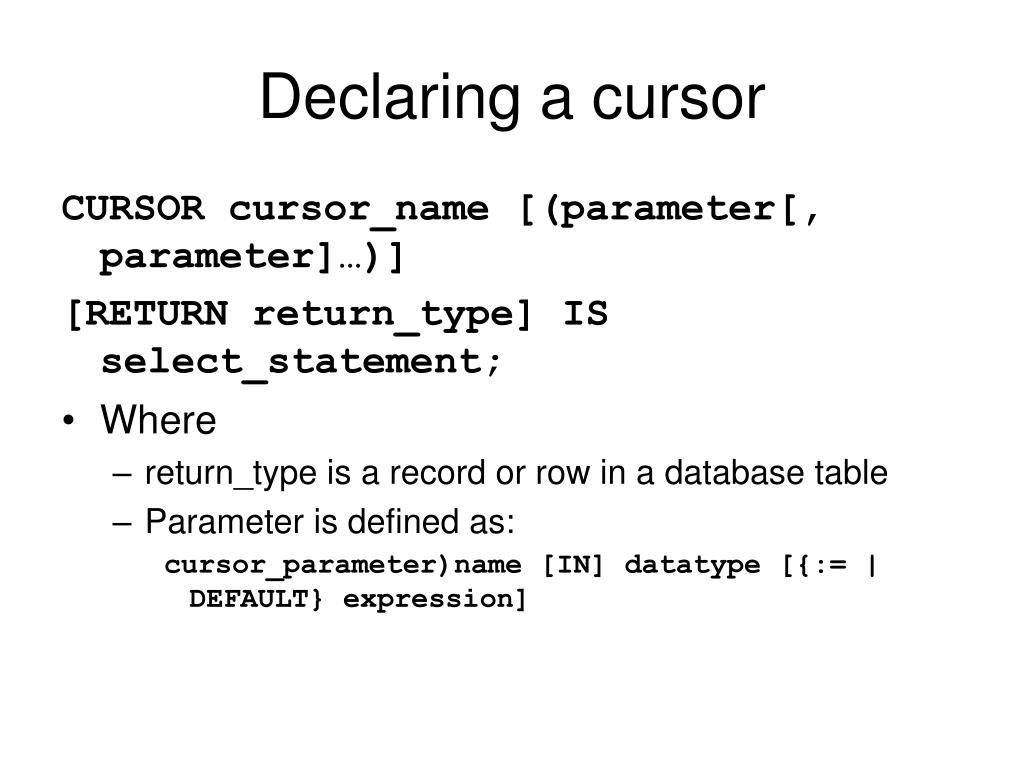 Declaring a cursor CURSOR cursor_name [(parameter[, parameter]…)] [RETURN return_type] IS select_statement; • Where • return_type is a record or row in a database table • Parameter is defined as: cursor_parameter)name [IN] datatype [{:= | DEFAULT} expression]