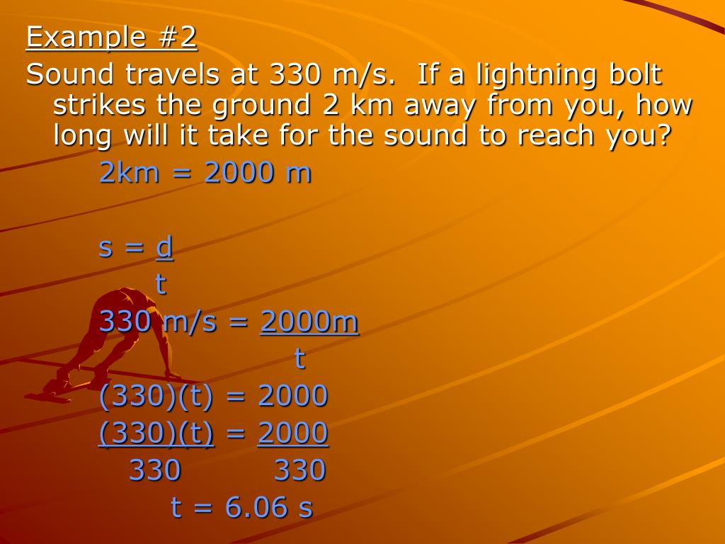 Example #2 Sound travels at 330 m/s. If a lightning bolt strikes the ground 2 km away from you, how long will it take for the sound to reach you? 2km = 2000 m s = d t 330 m/s = 2000m t (330)(t) = 2000 (330)(t) = 2000 330 330 t = 6.06 s