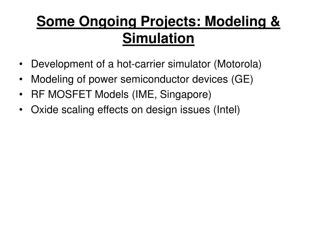 Some Ongoing Projects: Modeling & Simulation • Development of a hot-carrier simulator (Motorola) • Modeling of power semiconductor devices (GE) • RF MOSFET Models (IME, Singapore) • Oxide scaling effects on design issues (Intel)