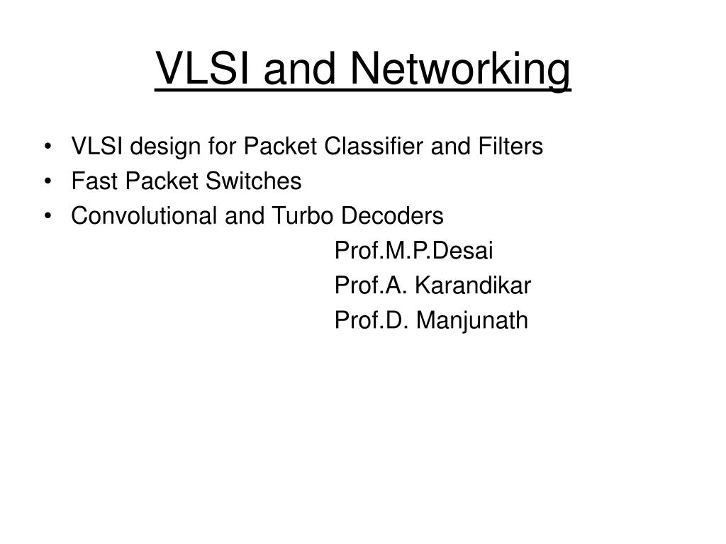 VLSI and Networking • VLSI design for Packet Classifier and Filters • Fast Packet Switches • Convolutional and Turbo Decoders Prof.M.P.Desai Prof.A. Karandikar Prof.D. Manjunath