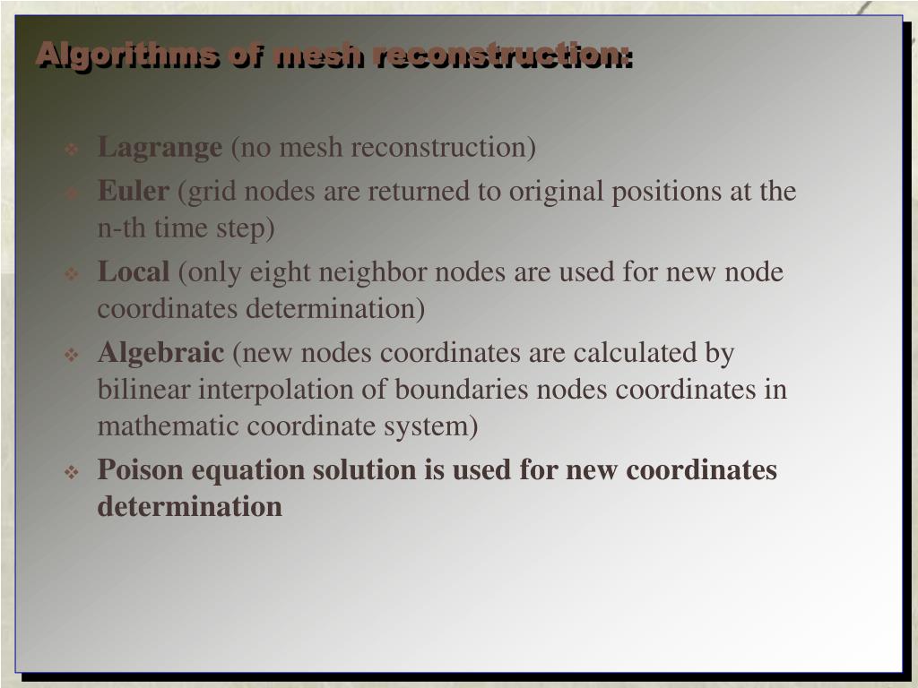 Algorithms of mesh reconstruction: • Lagrange (no mesh reconstruction) • Euler (grid nodes are returned to original positions at the n-th time step) • Local (only eight neighbor nodes are used for new node coordinates determination) • Algebraic (new nodes coordinates are calculated by bilinear interpolation of boundaries nodes coordinates in mathematic coordinate system) • Poison equation solution is used for new coordinates determination