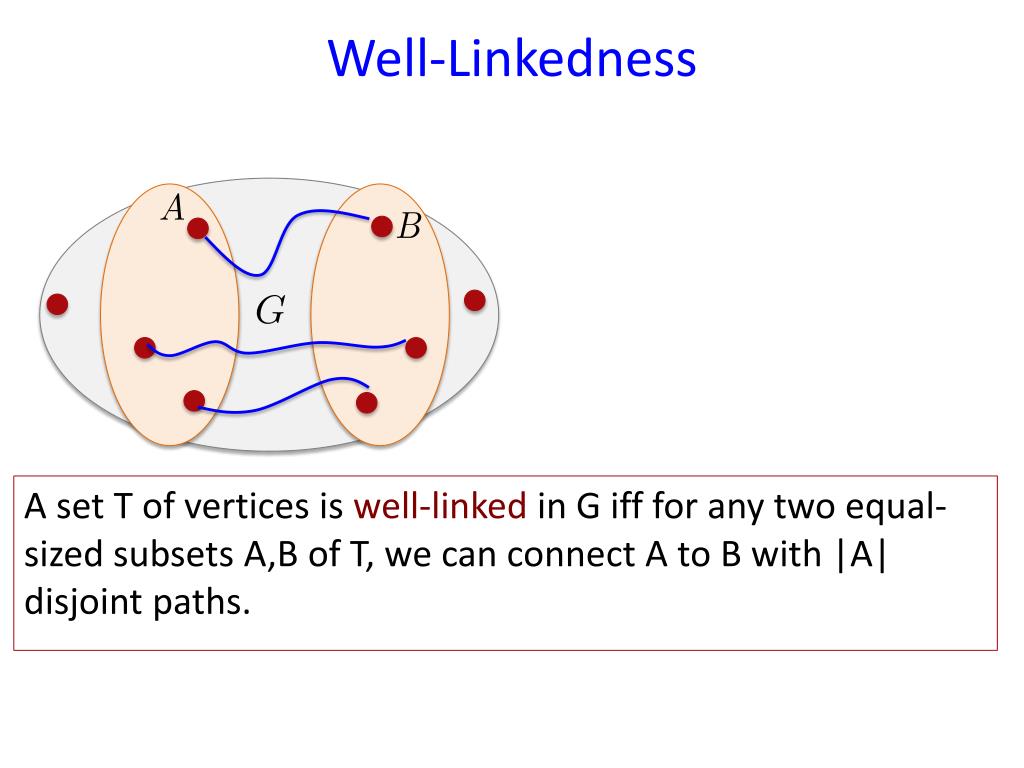 Well-Linkedness A set T of vertices is well-linked in G iff for any two equal-sized subsets A,B of T, we can connect A to B with |A| disjoint paths.