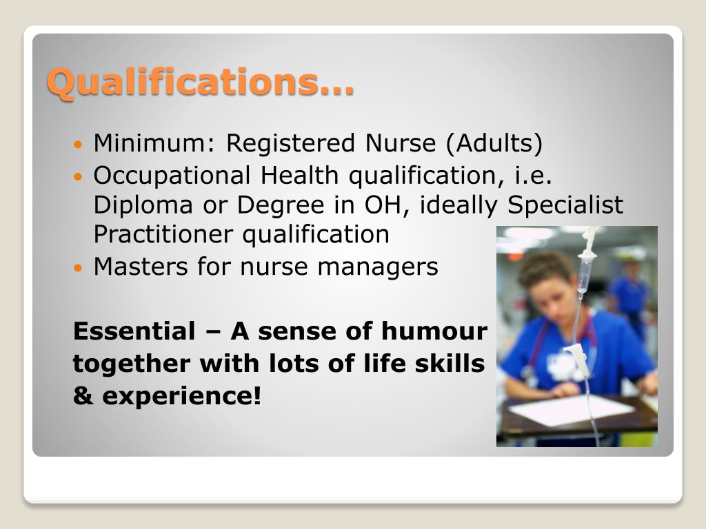 Minimum: Registered Nurse (Adults) • Occupational Health qualification, i.e. Diploma or Degree in OH, ideally Specialist Practitioner qualification • Masters for nurse managers Essential – A sense of humour together with lots of life skills & experience! Qualifications…