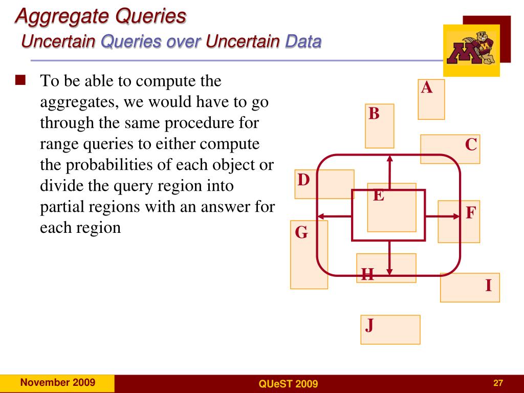Aggregate QueriesUncertainQueries over UncertainData • To be able to compute the aggregates, we would have to go through the same procedure for range queries to either compute the probabilities of each object or divide the query region into partial regions with an answer for each region A B C D E F G H I J