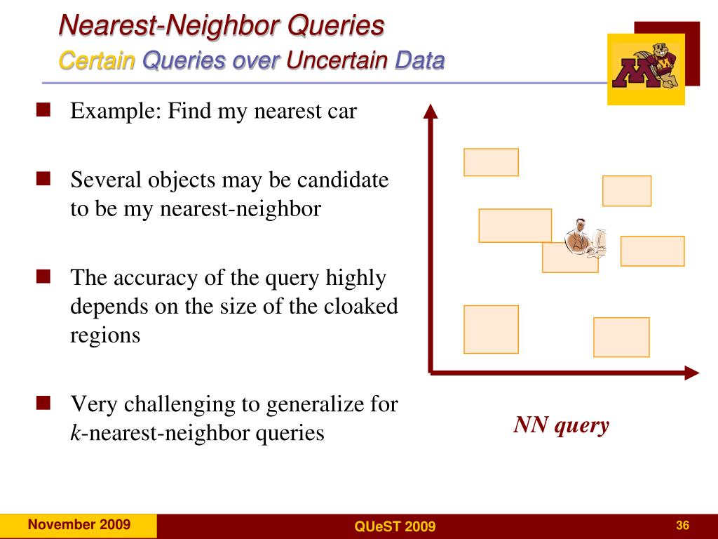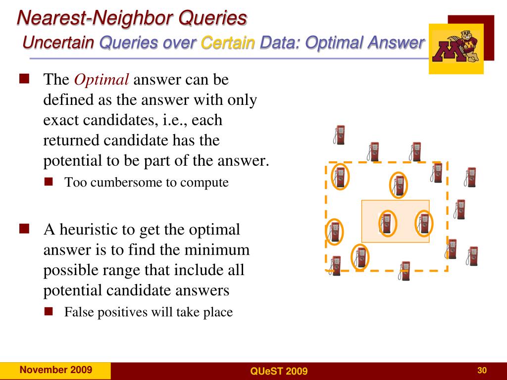 Nearest-Neighbor QueriesUncertainQueries over Certain Data: Optimal Answer • The Optimal answer can be defined as the answer with only exact candidates, i.e., each returned candidate has the potential to be part of the answer. • Too cumbersome to compute • A heuristic to get the optimal answer is to find the minimum possible range that include all potential candidate answers • False positives will take place