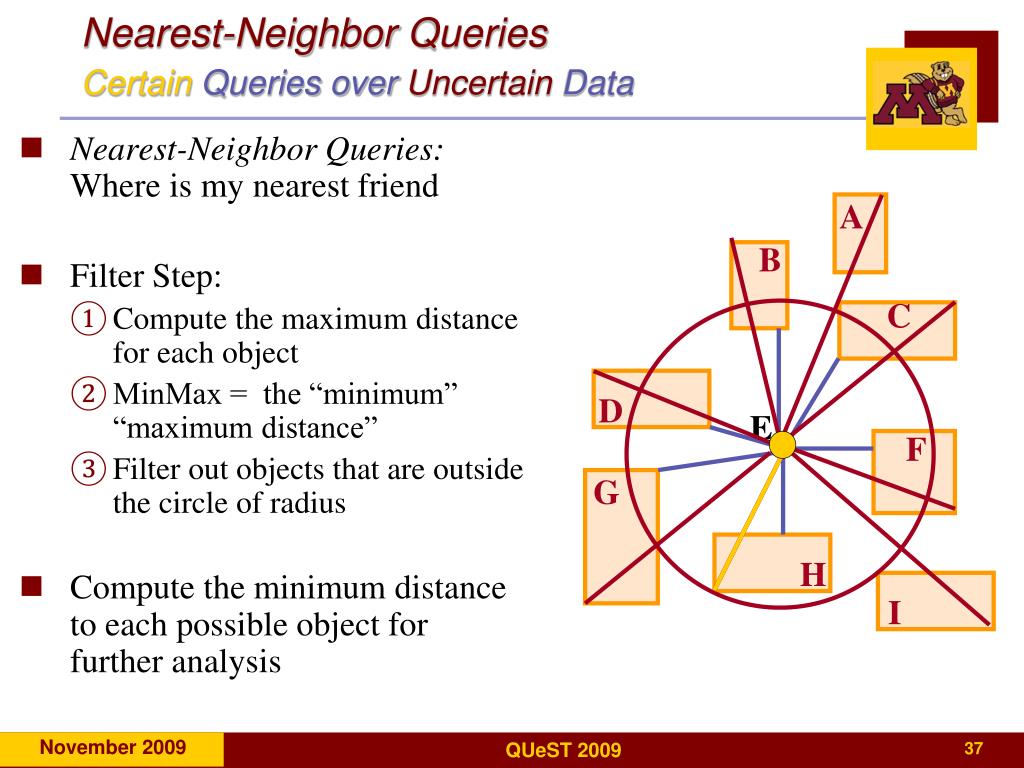 Nearest-Neighbor QueriesCertain Queries over UncertainData • Nearest-Neighbor Queries: Where is my nearest friend • Filter Step: • Compute the maximum distance for each object • MinMax = the “minimum” “maximum distance” • Filter out objects that are outside the circle of radius • Compute the minimum distance to each possible object for further analysis A B C D E F G H I
