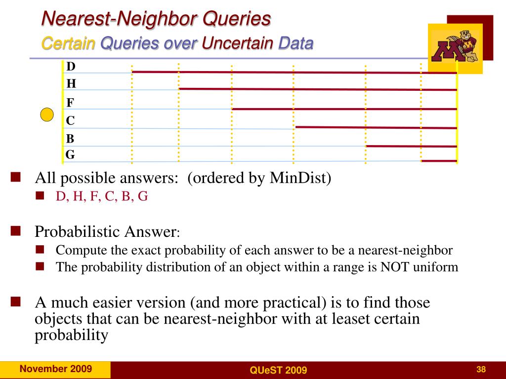 Nearest-Neighbor QueriesCertain Queries over UncertainData D • All possible answers: (ordered by MinDist) • D, H, F, C, B, G • Probabilistic Answer: • Compute the exact probability of each answer to be a nearest-neighbor • The probability distribution of an object within a range is NOT uniform • A much easier version (and more practical) is to find those objects that can be nearest-neighbor with at leaset certain probability H F C B G
