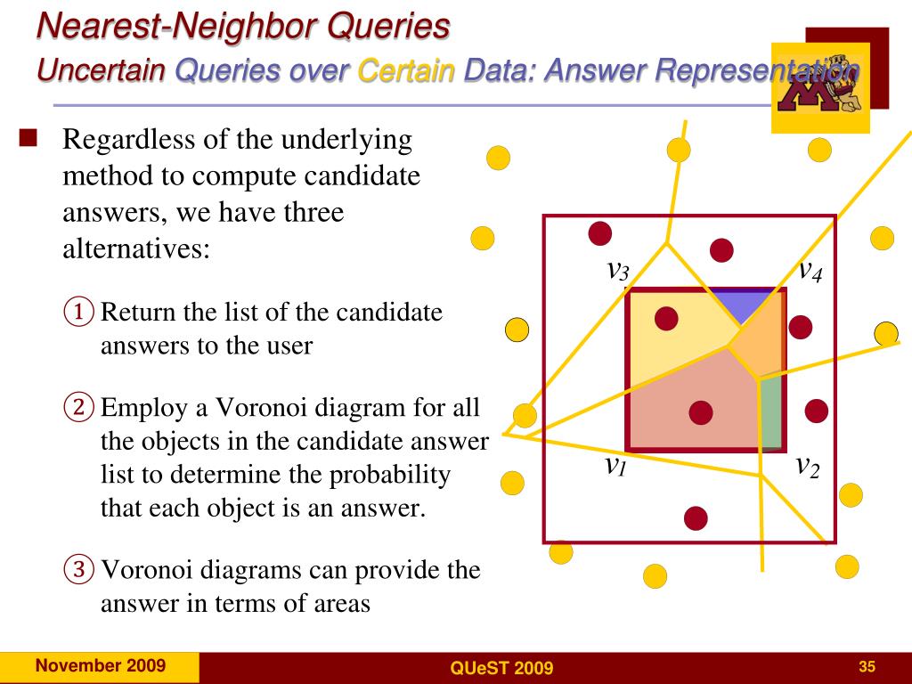 Nearest-Neighbor QueriesUncertainQueries over Certain Data: Answer Representation • Regardless of the underlying method to compute candidate answers, we have three alternatives: • Return the list of the candidate answers to the user • Employ a Voronoi diagram for all the objects in the candidate answer list to determine the probability that each object is an answer. • Voronoi diagrams can provide the answer in terms of areas v v 3 4 v v 1 2