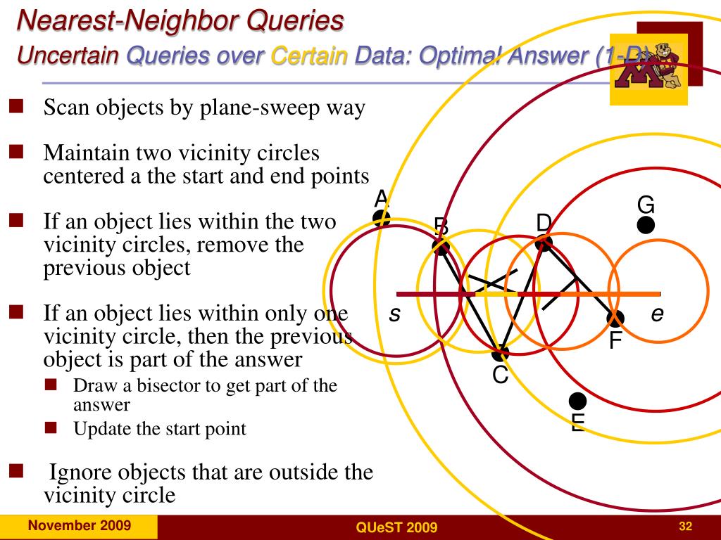 Nearest-Neighbor QueriesUncertainQueries over Certain Data: Optimal Answer (1-D) • Scan objects by plane-sweep way • Maintain two vicinity circles centered a the start and end points • If an object lies within the two vicinity circles, remove the previous object • If an object lies within only one vicinity circle, then the previous object is part of the answer • Draw a bisector to get part of the answer • Update the start point • Ignore objects that are outside the vicinity circle A G D B s e F C E