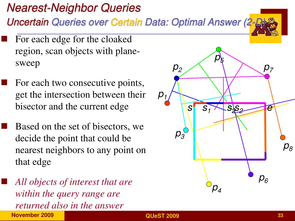 Nearest-Neighbor QueriesUncertainQueries over Certain Data: Optimal Answer (2-D) • For each edge for the cloaked region, scan objects with plane-sweep • For each two consecutive points, get the intersection between their bisector and the current edge • Based on the set of bisectors, we decide the point that could be nearest neighbors to any point on that edge • All objects of interest that are within the query range are returned also in the answer p5 p2 p7 p1 s s1 s2 s2 e p3 p8 p6 p4
