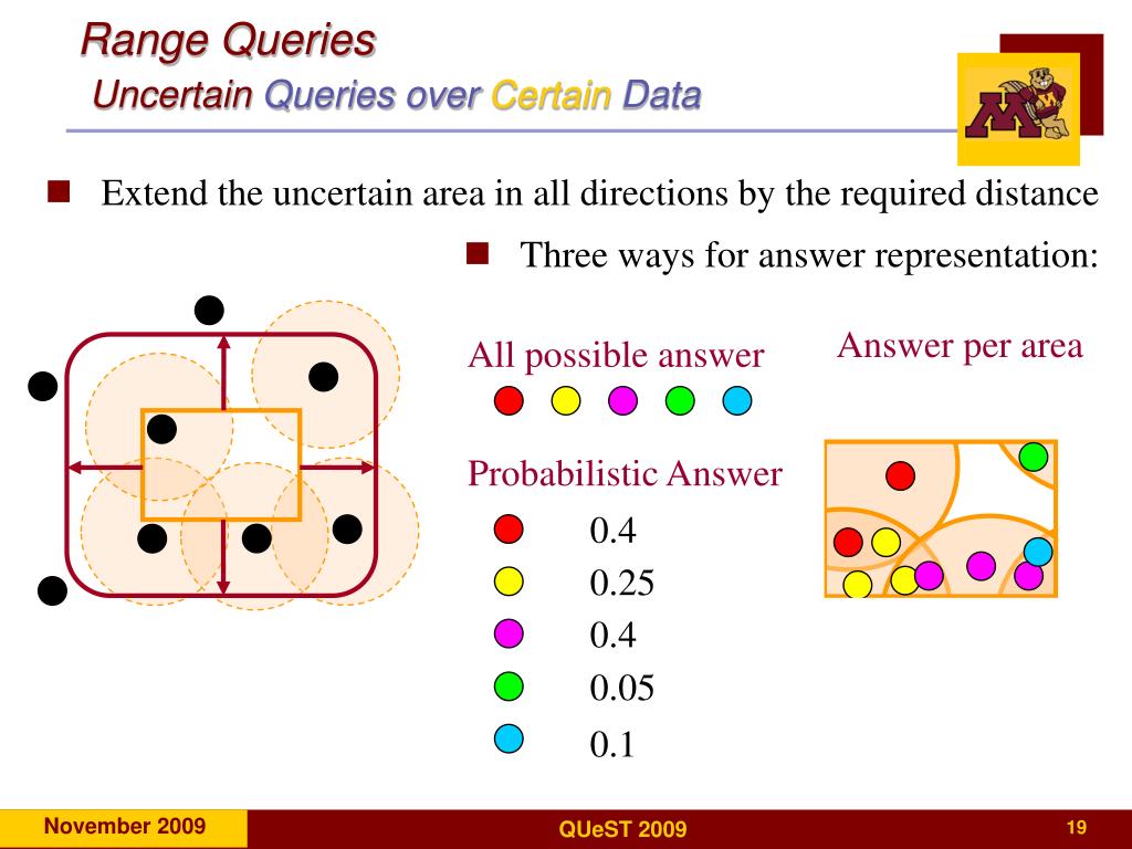 Answer per area All possible answer Probabilistic Answer Range QueriesUncertainQueries over Certain Data • Extend the uncertain area in all directions by the required distance • Three ways for answer representation: 0.4 0.25 0.4 0.05 0.1