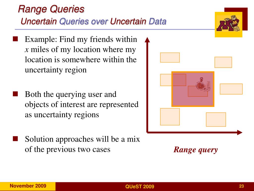 Range query Range QueriesUncertainQueries over UncertainData • Example: Find my friends within x miles of my location where my location is somewhere within the uncertainty region • Both the querying user and objects of interest are represented as uncertainty regions • Solution approaches will be a mix of the previous two cases