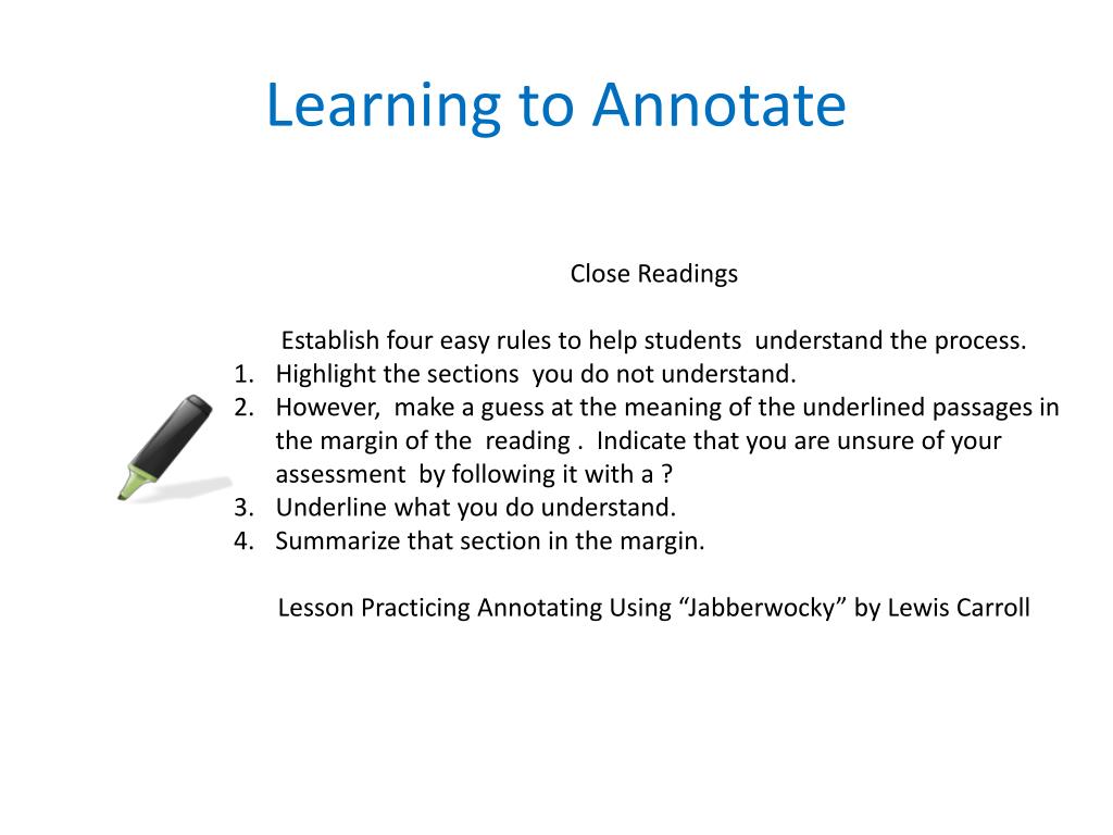 Learning to Annotate Close Readings Establish four easy rules to help students understand the process. Highlight the sections you do not understand. However, make a guess at the meaning of the underlined passages in the margin of the reading . Indicate that you are unsure of your assessment by following it with a ? Underline what you do understand. Summarize that section in the margin. Lesson Practicing Annotating Using “Jabberwocky” by Lewis Carroll