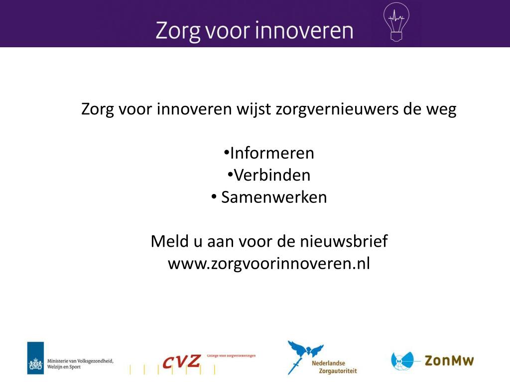 Zorg voor innoveren wijst zorgvernieuwers de weg • Informeren • Verbinden • Samenwerken • Meld u aan voor de nieuwsbrief • www.zorgvoorinnoveren.nl